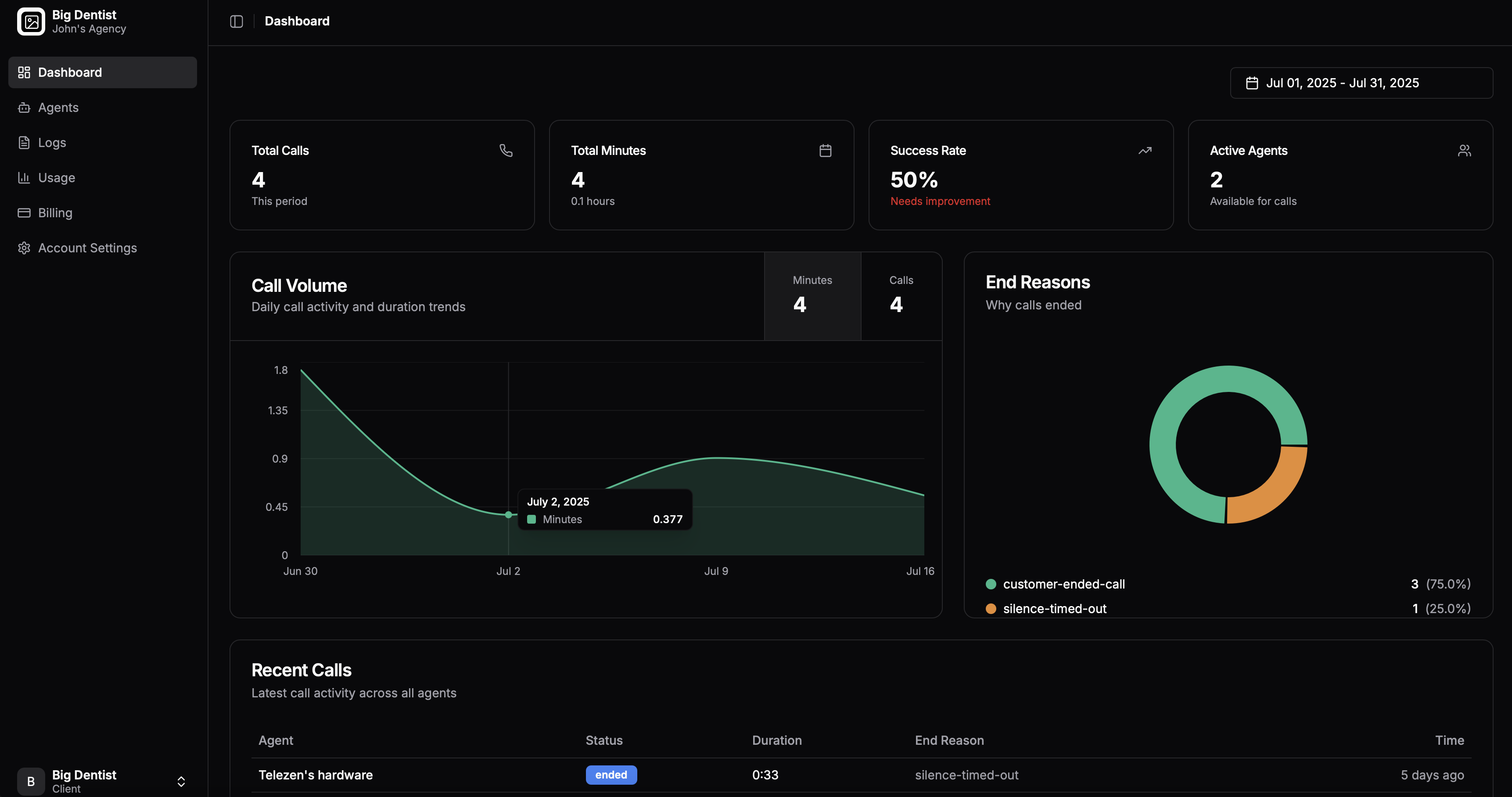 Agencies selling AI voice agents often lack a professional, branded dashboard to offer their clients. This leaves clients in the dark about agent activity and undermines the agency’s value.