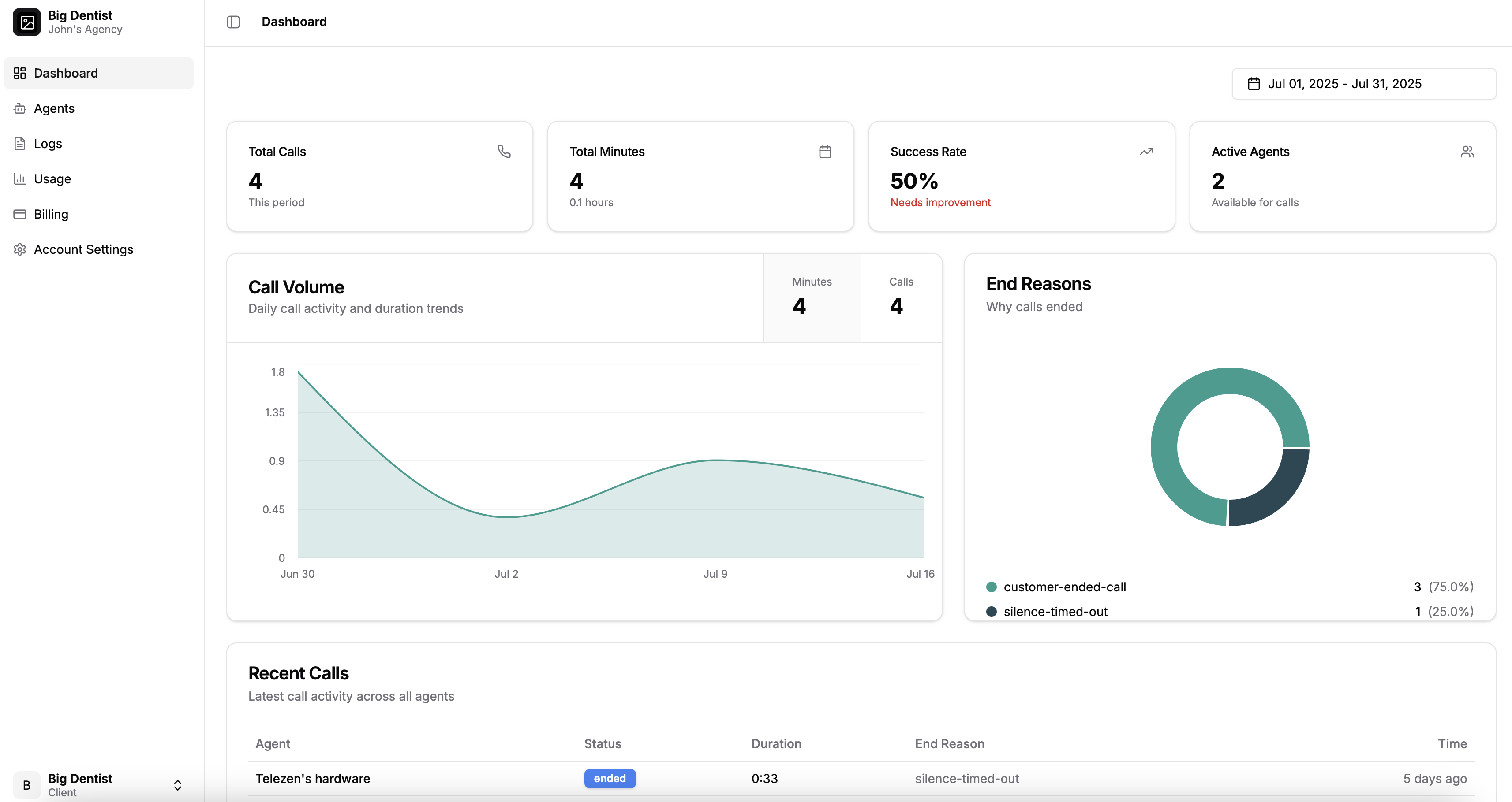 Clients want to see clear insights into their AI voice agent performance and call logs